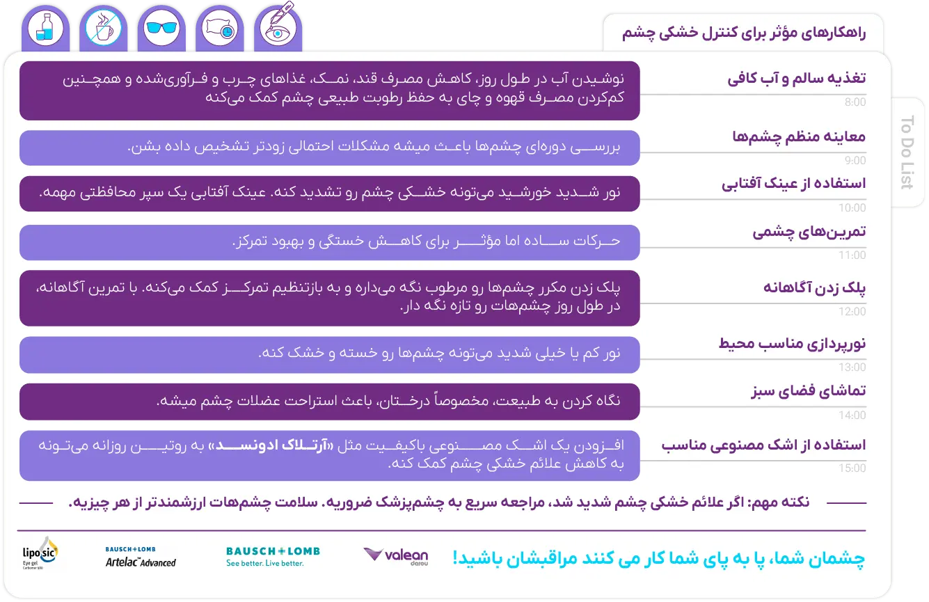 برای پیشگیری و کنترل خشکی چشم، داشتن تغذیه سالم و نوشیدن آب کافی، کاهش مصرف قند و کافئین، خواب منظم، نورپردازی مناسب، پلک زدن آگاهانه و انجام تمرینهای چشمی اهمیت دارد. استفاده از عینک آفتابی، نگاه کردن به فضای سبز و افزودن اشک مصنوعی باکیفیت مانند آرتلاک ادونس به روتین روزانه نیز میتواند کمککننده باشد. در صورت بروز علائم شدید، مراجعه سریع به چشمپزشک ضروری است تا درمان تحت نظر پزشک انجام شود؛